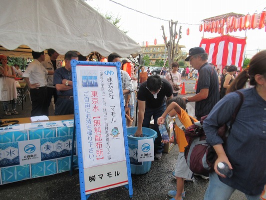 平成30年7月27日(金曜日)、近隣の広場にて毎年恒例の鎌田南睦会主催の盆踊りが行われ、弊社も準備ならびに後片付けのスタッフとして参加致しまた。当日は台風が接近しておりましたが雨が降ることもなく、多くの子供や近隣の方々で賑い、やきそばなどの模擬店では長い行列ができておりました。弊社においても新舘グループの株式会社マモルで東京水を無料で300本を配布し、出店から1時間ほどで終了いたしました。