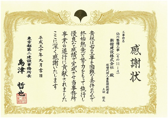 平成30年9月12日に東京都第二建設事務所様より、仙川整備工事(その11-4)の感謝状をいただきました。仙川の整備につきましては、長年にわたり弊社にて工事を実施しており、今回の工事については、現場周辺に家屋が隣接しており、また、現場の施工ヤードが非常に狭く、施工条件としては非常に厳しい状況でありました。騒音・振動対策の徹底、道路規制時における保安対応の強化、効率的な施工方法の変更などに重きを置いて施工を行い、無事に工事の完成を迎えることができ、これも地元住民の方はもとより、発注者および協力会社の皆様方のご指導ならびにご協力の賜物だと心から感謝しております。