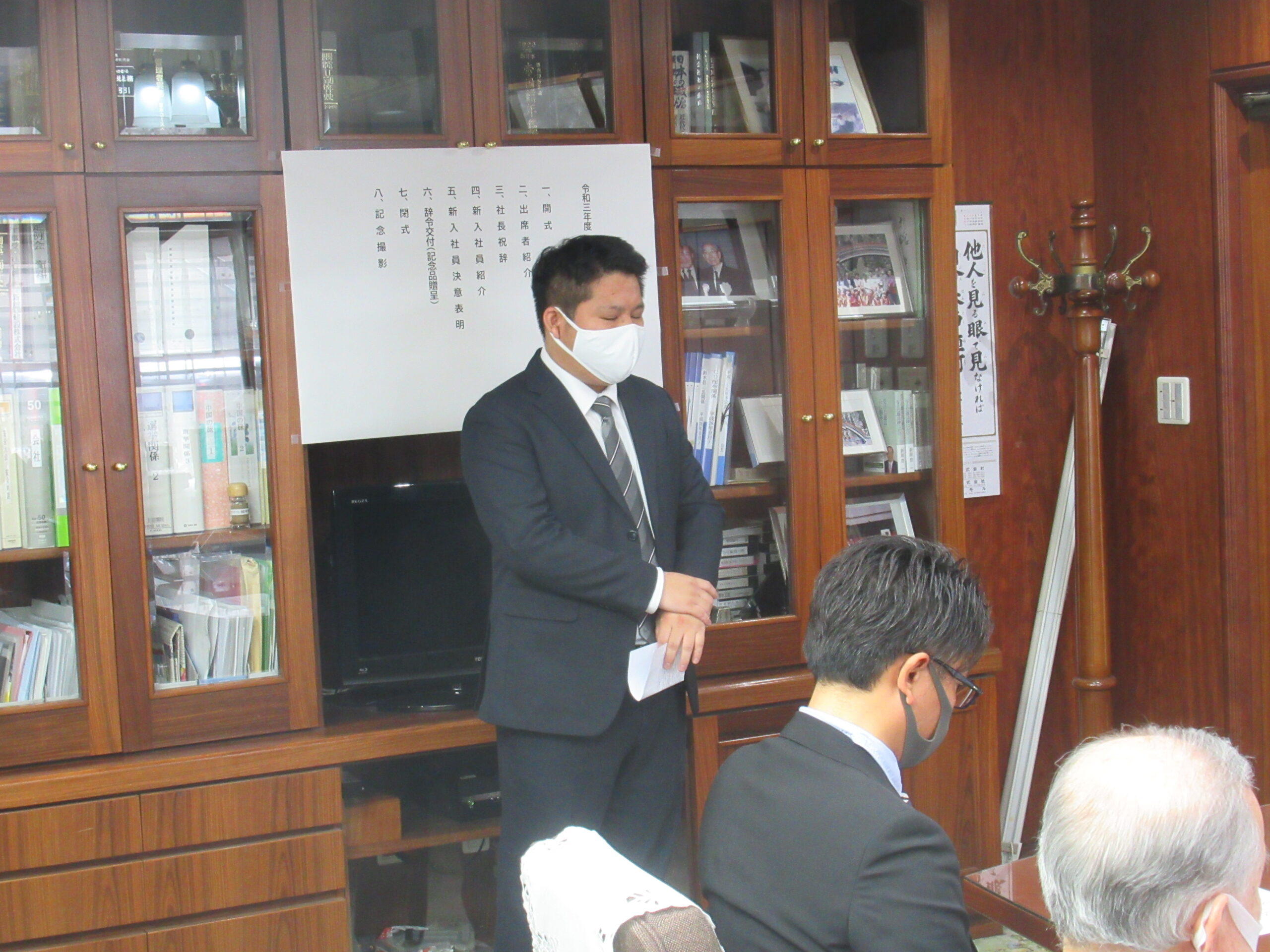 掲題の件にて、4月1日に入社式が執り行われ、今年は3名の新入社員が仲間入りしました。最初はおどおどしてかなり緊張しているようすでしたが、社長の気さくで朗らかな人柄が伝わりだいぶ肩の力が抜けたようです。
