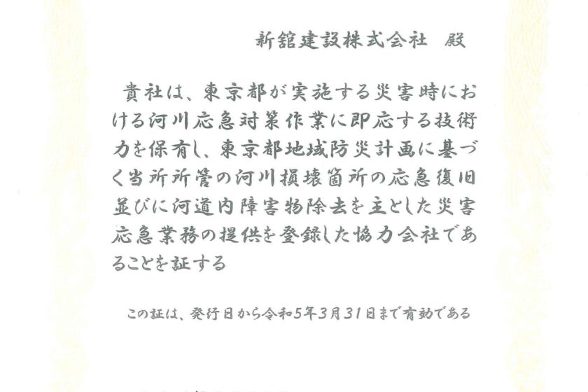 東京都地域防災計画に基づいて、河川損傷個所の応急復旧ならびに可動内障害物除去等を目的とした災害応急業務の提供を行っていきます。 令和4年度入社式を執り行いました 前の記事 若手社員研修を実施しました 次の記事